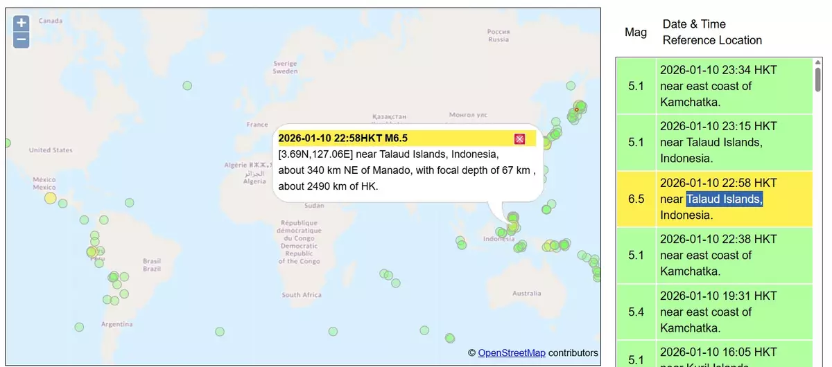 印尼托貝洛島附近海域發生黎克特制6.7級地震。香港天文台網站圖片