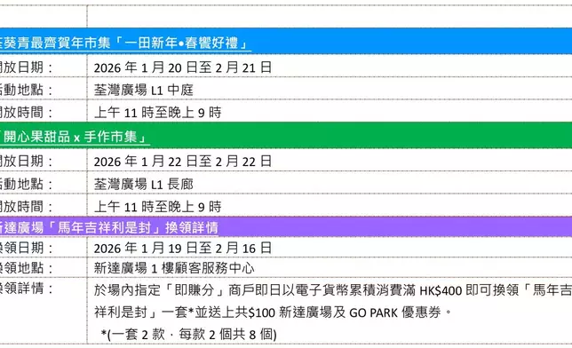 是次新春以「光影+花見+祈願」為主題,設有3大春日互動體驗及3大祈願打卡熱點,更可限量換領萌爆兼一物兩用「金馬花開・座枱揮春利是封」,結合新春裝飾與實用功能,送禮自用皆宜。同場更帶來全荃葵青區人氣最高的「一田新年・春饗好禮」,以及甜蜜登場的「開心果甜品x手作市集」,讓你食、買、玩一站式賀新春。另外,新達廣場亦為大家準備了「馬年吉祥」利是封,活力小福馬陪大家過個發財年。