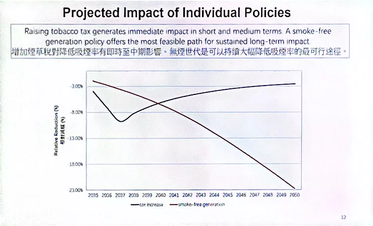 另外,委員會委託香港中文大學醫學院賽馬會公共衞生及基層醫療學院就控煙政策的預期影響進行研究,顯示各項控煙措施在短、中、長期發揮相應效力。其中,若香港將煙草稅提高至佔煙價 75%,並其後10年每年上調5%,能夠在中期顯著降低吸煙率。至於「無煙世代」政策,即逐步提高最低合法購買煙草年齡,最終達至長遠禁煙的政策,更是關鍵而有力的措施,單一政策效果推算是,其影響會隨時間逐漸增強,在長期達到最大的效果,減幅力度會一直持續和加強。