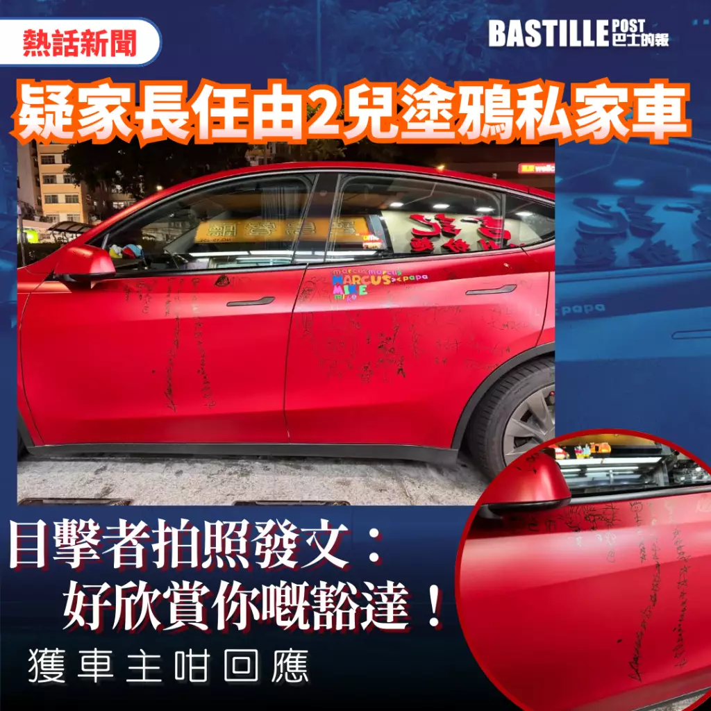不少車主都視自己的愛車如珠如寶,不容許車身有任何花痕,日前就有網友在街頭驚見一架紅色私家車,車身竟佈滿了疑似小童的塗鴨,於是拍下照片,上載至社交平台和網民分享,並寫到「聽講Threads好易搵人,想同呢位爸爸講聲,好欣賞你架車,好欣賞你嘅豁達」怎料帖文真的引來車主親自回應。