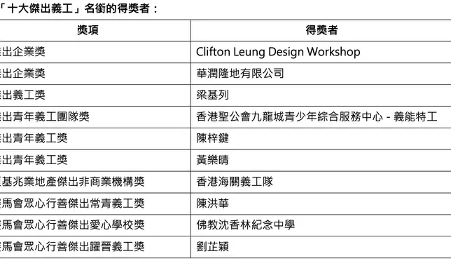 今年更設立「十大傑出義工」名銜,從各傑出類別中甄選具卓越貢獻的義工,向他們的無私奉獻致以崇高敬意,更增設「青年制服團體義工獎(義工時數)」獎項,旨在鼓勵青年透過參與制服團體展現行義精神,為有需要人士送上關懷。獲「十大傑出義工」名銜的得獎者: