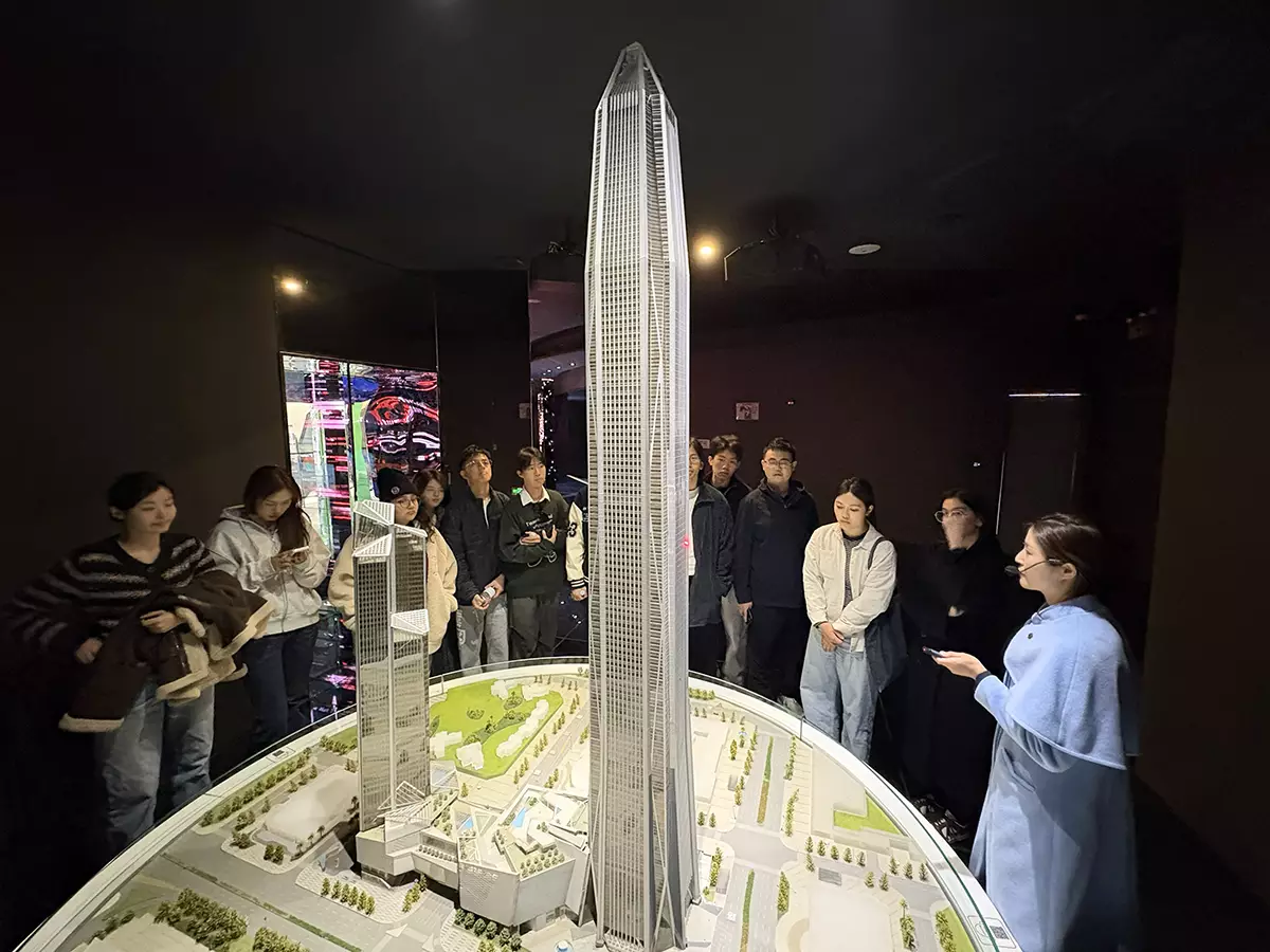 參與「灣區 T+ 研學遊2.0」的青年走進深圳平安金融中心雲際觀光層,深入了解建築背後的精密技術與現代化設計理念,並思考文旅融合與現代城市發展的互相成就。