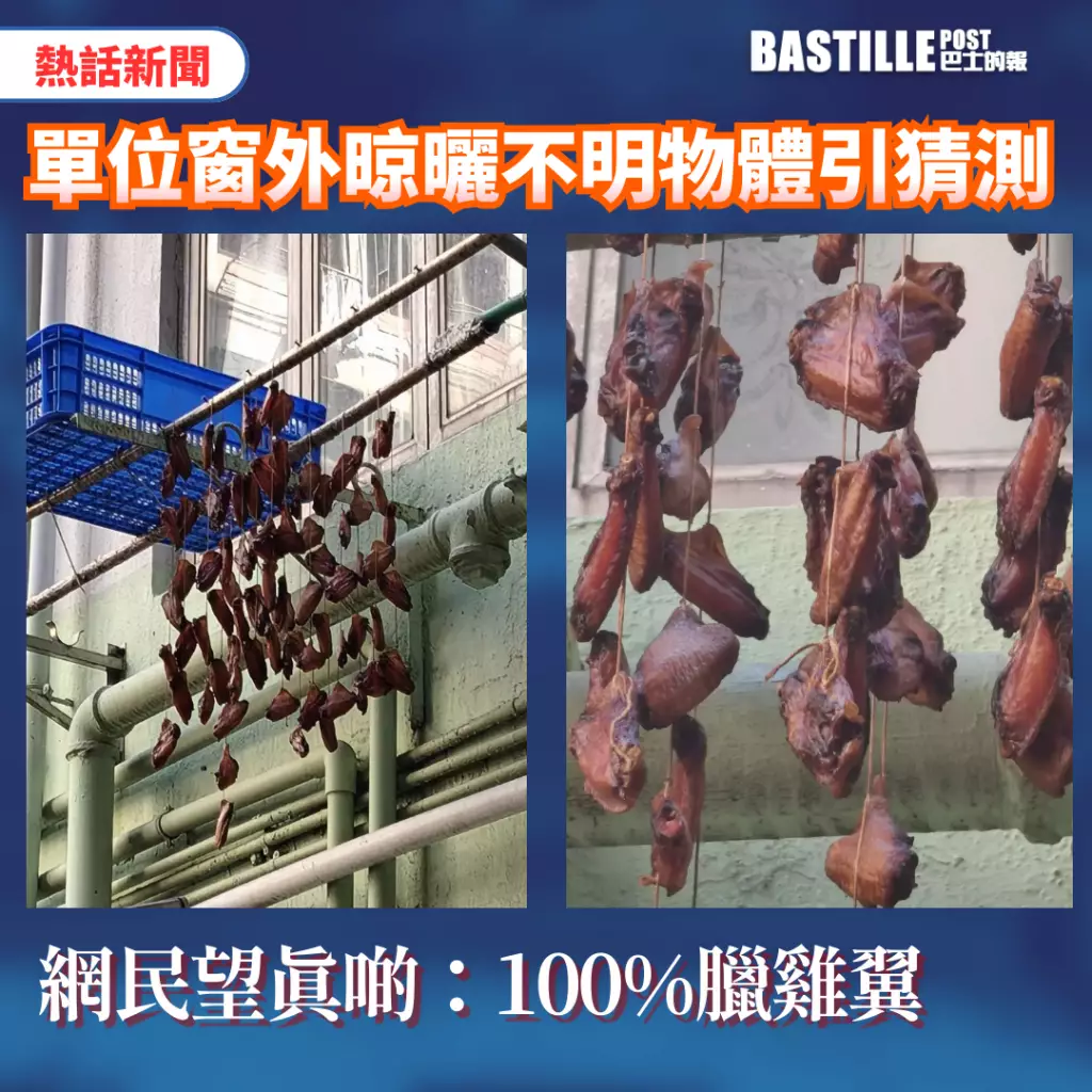 北風起,有市民會趁機在窗外晾曬臘味,曬臘肉、臘腸就見得多,但日前有網民在社交平台分享,見到有大廈單位外的晾衣架掛着形狀特別,不明物體,詢問大家「估吓係乜」。