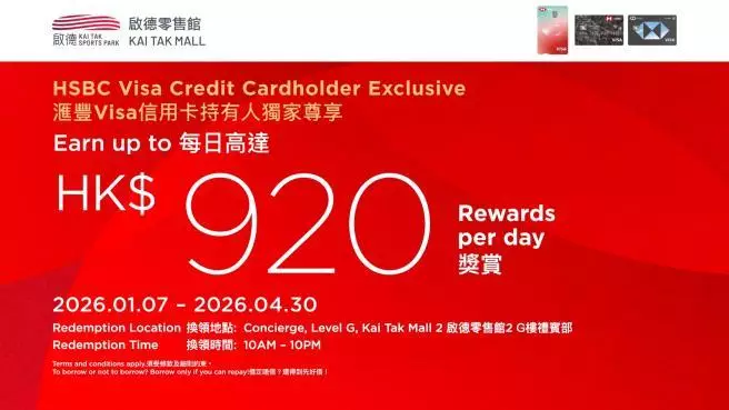 啟德體育園消費獎賞停不了!即日起至4月30日,憑滙豐 Visa 信用卡於啟德零售館、啟德體藝館、運動健康中心及美食海灣之商戶簽賬,每日可享合共高達港幣$920 獎賞及精選商戶禮遇。