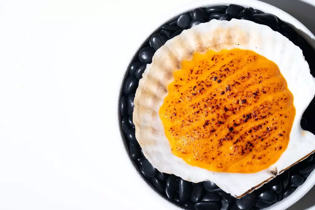 帶子配西班牙燉菜餡及慕絲醬:鮮甜帶子搭配 sofrito 醬料,並以輕盈慕絲提升細膩口感,展現西班牙料理的精緻一面。