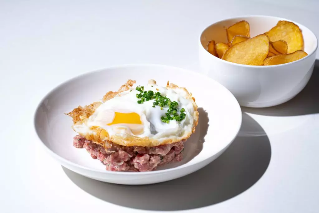 牛肉他他配香煎蛋及自家製薯片:經典西班牙風格的牛肉他他,結合蛋香與薯片的酥脆口感,層次分明,令人回味。