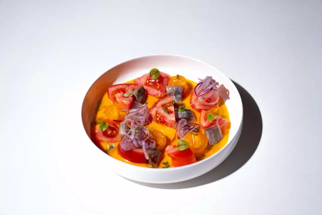 番茄沙律配煙燻沙甸魚、紅洋蔥及西班牙冷湯:清爽的 gazpacho 沙律,煙燻沙甸魚的鹹香與番茄的酸甜交織,帶來夏日般的清新滋味。