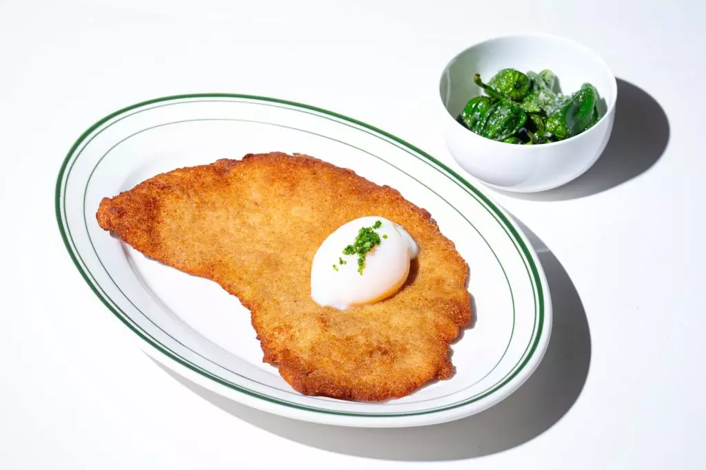 香煎豬柳配太陽蛋及青椒:經典 Escalope 的升級版,融合西班牙 Padrón青椒的微辣風味,平衡濃郁與清爽。