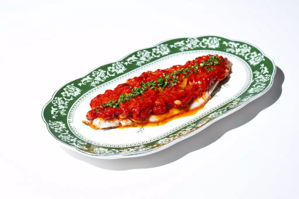 香煎鱸魚配燉紅椒:鱸魚鮮嫩多汁,搭配西班牙 piquillo 紅椒的甜美,呈現地中海的清新與濃郁。