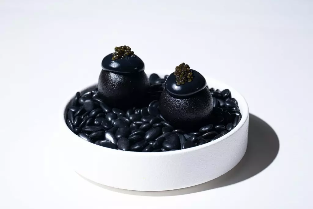 「黑曜之饌」魷魚燉菜配魷魚蛋黃醬及魚子醬:以魷魚墨汁打造的獨特小食,結合魚子醬的奢華點綴,視覺與味覺同樣驚艷。