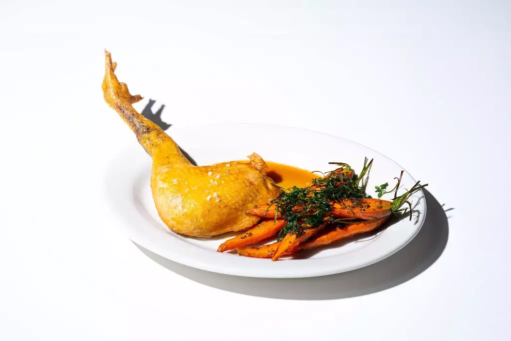原隻雞腿配嫩胡蘿蔔及肉汁:嫩滑雞腿搭配甜美蔬菜,肉汁濃郁而平衡,展現西班牙料理的樸實與細膩。