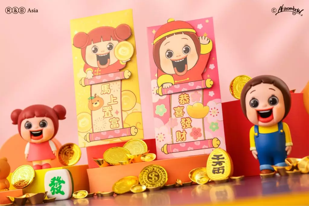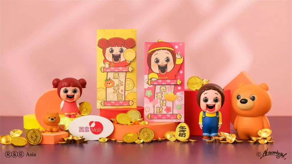 置富Malls 的利是封設計每年都達到珍藏級水準。今年設計師同樣花盡心思,讓歡樂的燦子及妹妹小琪在利是封上展示獨有的「燦」式笑容,傳遞祝福,一套兩款共8個的「置富Malls x SHO-CHAN.置『燦』你笑口常開利是封套裝」,桃紅色系利是封的燦子穿上賀年裝束,舉起充滿朝氣的小手向大家打招呼,靈巧的滑動機關一拉即顯示「恭喜發財」,祝願來年運勢亨通!而在充滿活力的橙黃色系中,小琪的小手捧着「KUMA」金幣,拉開捲軸祝大家「馬上置富」,健康運和財運都直逼小琪笑容般璀璨!細看背面,燦子和小琪歡天喜地跟大家拜年!背景的桃花、金幣跟祝福語更以燙金點綴,既顯貴氣又不落俗套,完美展現利是封的設計魅力,不論是否燦粉,必收一套!。