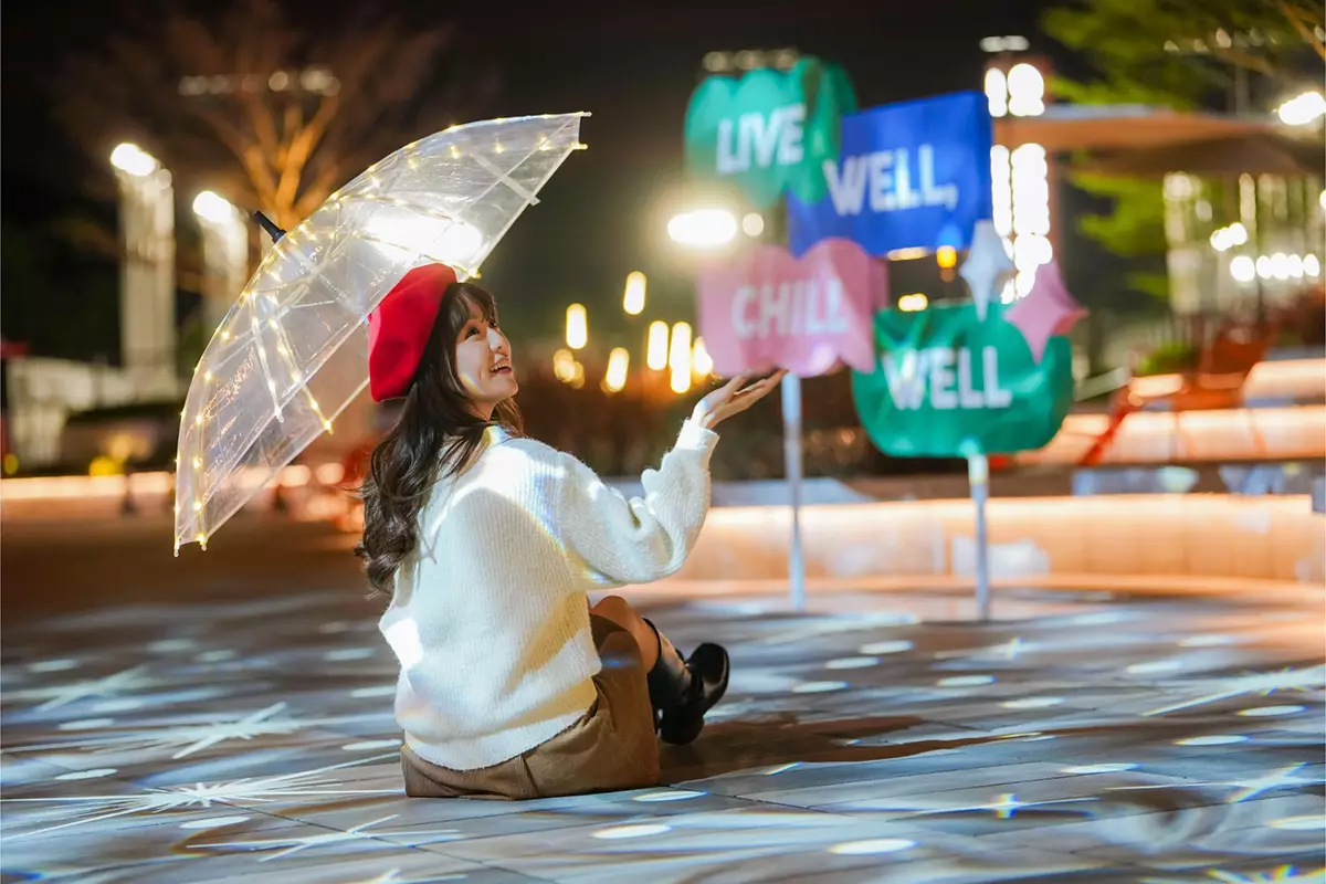 此外,位於地面休憩空間的戶外光影長廊將延續 12 月的浪漫氛圍,以幻彩色調與光影投射呈現全新桃花主題,並提供免費租借適合夜攝的浪漫發光道具「星光雨傘」,助您輕鬆拍下唯美動人的節日相片。