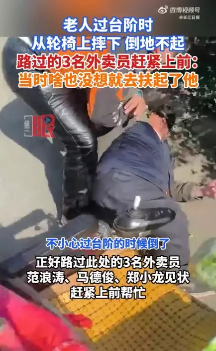 1月10日,武漢一名老翁在洪山區左嶺街祥龍社區附近乘坐輪椅經過台階時不慎失去平衡翻倒,倒地後一度無法自行起身。3名途經現場的外賣員見狀,隨即停車上前施以援手,整個過程被途人拍下並上載至網上,引發廣泛關注。