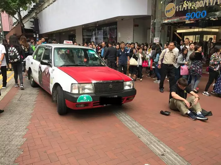銅鑼灣崇光百貨(SOGO)門外,一輛的士失控剷上行人路,5名途人走避不及,被撞傷倒地,救護員到場把傷者送院治理。警員在場調查。