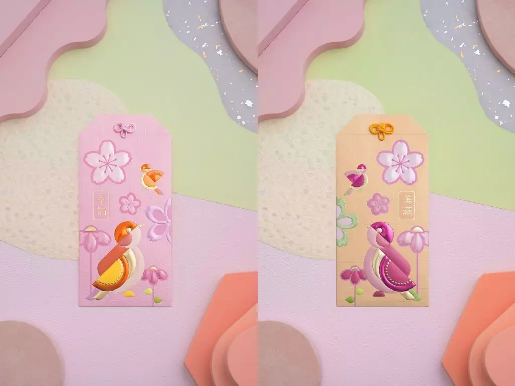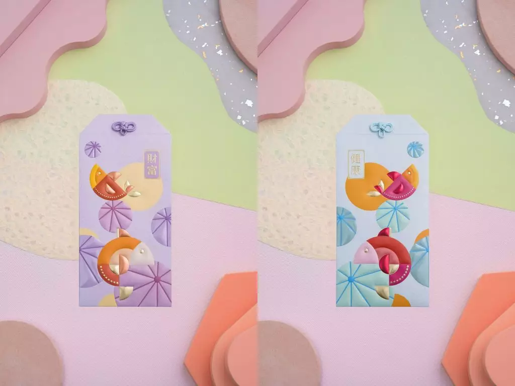 「金瑞福運」御守利是封跳出大紅大紫的傳統框框,別出心裁地改以淡雅柔和的粉彩色調示人,感覺清新脫俗,為新春注入溫柔而高雅的氣息,以煥然一新的感覺迎接新春。封套配合華麗燙金激凸印刷工藝,低調中見華貴,無論遠觀近看都閃耀動人,盡顯高雅格調。四款設計分別代表不同的祝願——「幸福御守」、「美滿御守」、「健康御守」與「財運御守」,並以象徵「喜上眉梢」的靈動鳴鳥與悠然寓意「年年有餘」的鯉魚為主軸,一動一靜,寓意新一年萬事順遂、福運齊來的美好祝願。值得一提的是,四款御守在設計上暗藏巧思,御守可互相拼砌,呈現別具心思的效果: