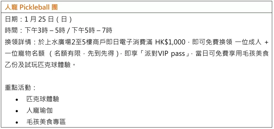 1 月 25 日登場的人寵 Pickleball團」, 主人可與毛孩一同參與特別設計的匹克球體驗之餘,更可參加人寵瑜伽,現場更配合精緻的人寵美食,共享難忘的運動時光。