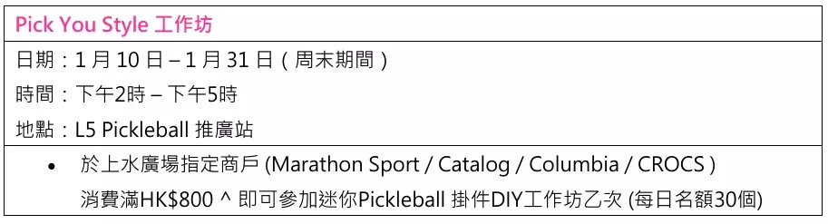 此外,於即日起至 1 月 31 日的周末期間,顧客凡於上水廣場指定商戶(Marathon Sports、Catalog、Columbia 或 CROCS)消費滿港幣 800 元,即可參加一次 「 Pick You Style 工作坊」(每日名額 30 個)。參加者可即場DIY親手製作專屬迷你 Pickleb all 掛件,隨心配搭顏色與配件,打造獨一無二的潮流小物。完成品既可用作鎖匙扣,也能成為袋上的時尚裝飾,讓匹克球精神隨身展現。不僅能在球場上大放異彩,更能融入日常生活,化身為型格細節,時刻展現你的獨特風格。