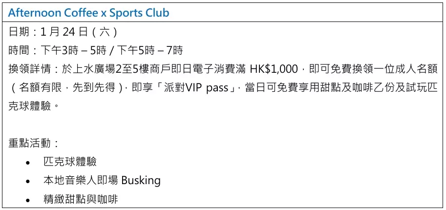 在匹克球節期間率先登場的 Afternoon Coffee x Pickleball Club」 將於 1 月 24 日舉行,專為喜愛運動與生活美學的都市人打造一個輕鬆自在的午後時光。活動當日設有兩個時段(下午 3 至 5 時及 5至 7 時),只需於上水廣場消費滿港幣 1,000 元即可參加。參加者可在空中花園免費試玩匹克球體驗,更享用精緻甜點與咖啡,營造悠閒氛圍,讓人徹底放鬆。現場亦邀請本地音樂人即場 Busking,讓音樂與運動交織,為參加者帶來一場既動感又療癒的午後聚會。