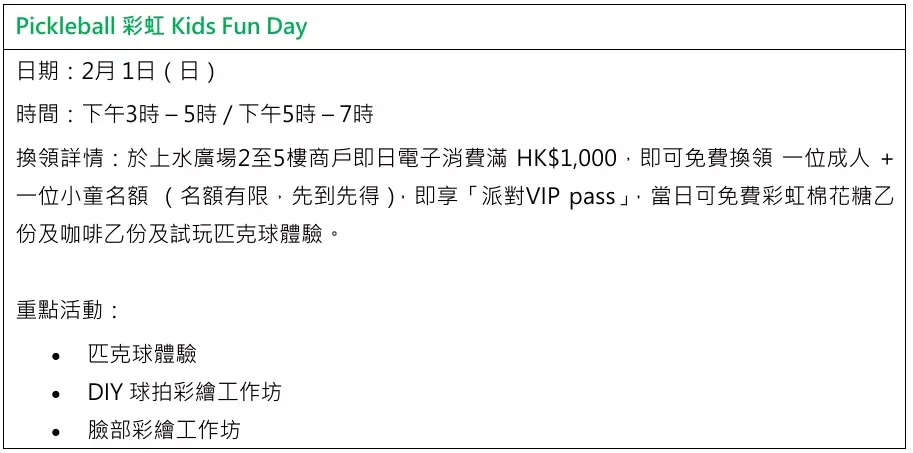 「Pickleball 彩虹 Kids Fun Day」 將於 2月 1 日舉行,特別為親子家庭於周日打造歡樂時光。只需於上水廣場消費滿港幣 1,000 元,即可換領一位成人及一位小朋友的參加名額。孩子們除了能親身體驗匹克球的樂趣,還可投入多元化的創意活動,包括臉部彩繪工作坊,讓臉龐化身繽紛畫布,成為場內最亮眼的小明星。更有DIY 球拍彩繪讓孩子盡情發揮創意,設計屬於自己的匹克球裝備,並可帶回家珍藏,留下難忘回憶。現場更會免費派發彩虹棉花糖,增添色彩和歡樂。絕對是一個親子共融的快樂盛會,將運動與藝術完美融合 。