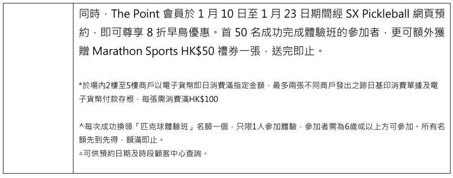 同時,The Point 會員於即日起至 1 月 23 日期間經 SX Pickleball 網頁預約,即可尊享 8折早鳥優惠。首 50 名成功完成體驗班的參加者,更可額外獲贈 Marathon Sports HK$50 禮券一張,送完即止。