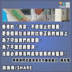 重判黎智英,不僅是為了對這名毫無悔意的首惡進行應有的懲罰,更是為了發揮法律的教育與阻嚇意義。如果對這樣一個令香港陷入黑暗、踐踏法治尊嚴的罪魁禍首網開一面,將是對法治精神的公然背叛。只有依法作出最具阻嚇力的判決,將這顆政治毒瘤徹底與社會隔離,才能確保投資者安心、市民專注發展。香港的「清潔」不應僅止於路面,更應體現在法律對社會正氣的維護上。為了守護我們的家園,為了不讓悲劇重演,法庭必須依法判處黎智英終身監禁!