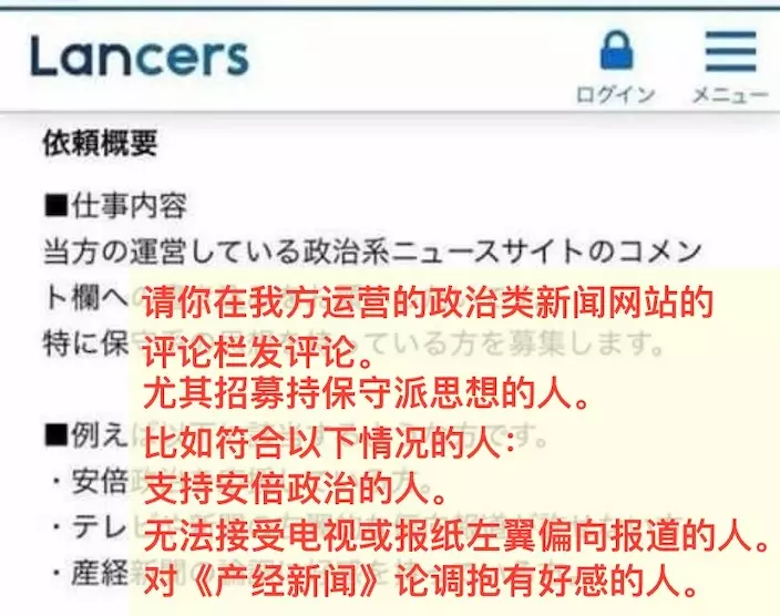 CrowdWorks並非個例。日本另一大型眾包平台Lancers上也曾出現類似招募信息,要求給保守派運營的政治類新聞網站撰寫留言跟帖,招募對象需「支持(前首相)安倍(晉三)政治」「無法接受電視或報紙左翼傾向報道」「對(右翼媒體)《產經新聞》論調抱有好感」等。