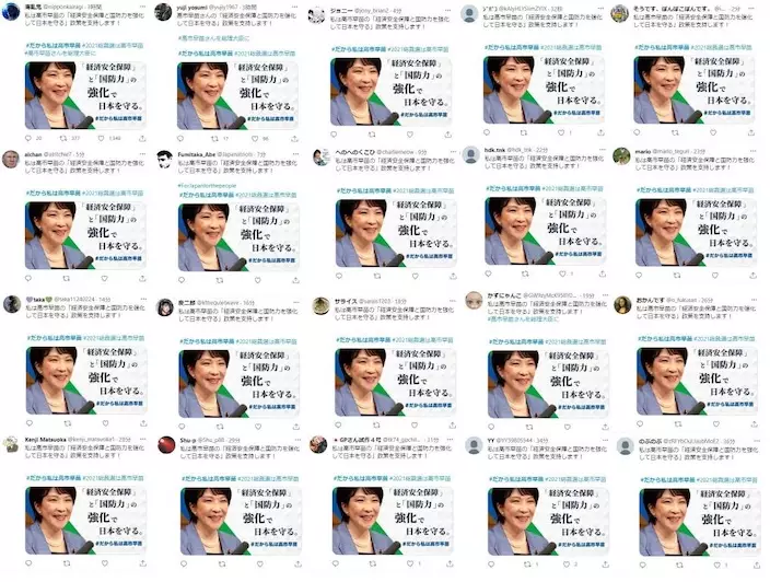 日本社交媒體平台充斥如「當然只能支持高市早苗」「高市早苗拜托了」等內容相似的帖文。