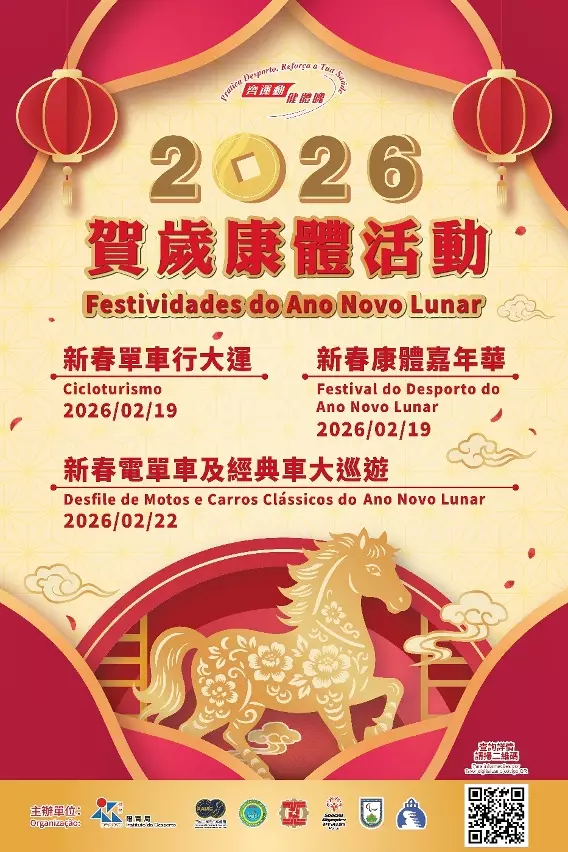 為喜迎甲午馬年的來臨,體育局將於農曆正月初三(2月19日)及初六(2月22日)深入社區舉辦「2026賀歲康體活動」,系列活動包括「新春單車行大運」、「新春康體嘉年華」及「新春電單車及經典車大巡遊」,歡迎全澳市民及旅客踴躍參與。活動內容豐富,尤其適合家庭親子同樂,讓大家在歡度佳節的同時,也能透過多元化的康體活動鍛鍊身心。