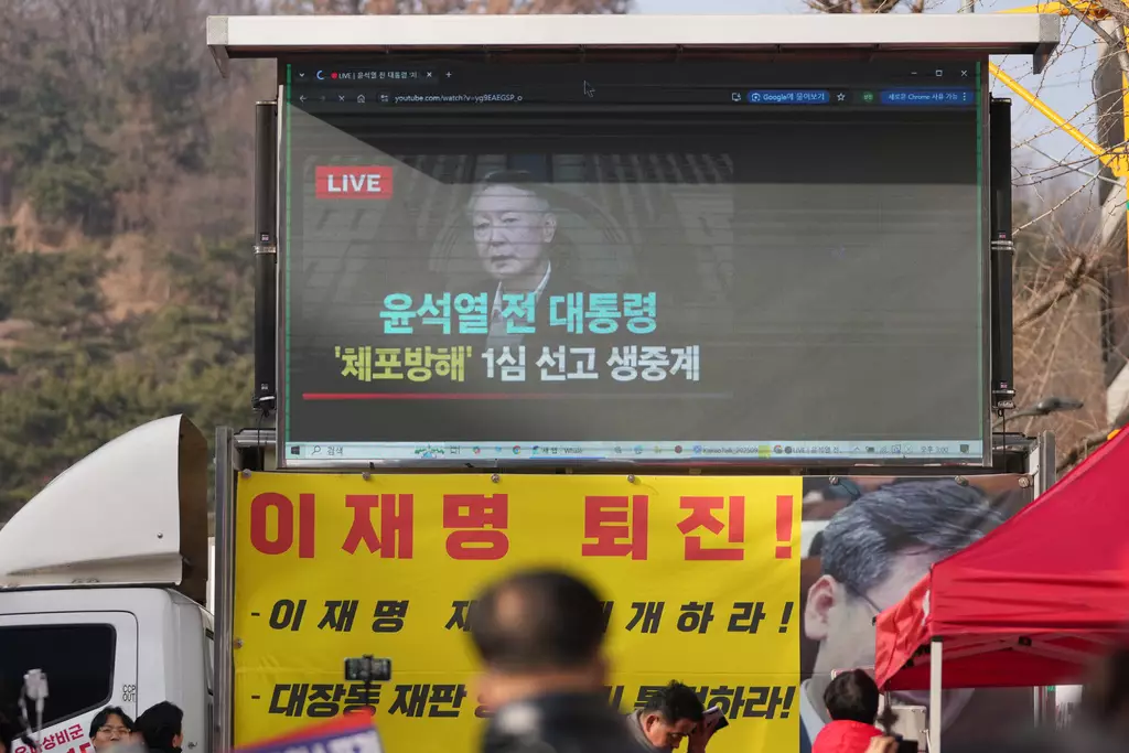 法院外的大電視播放尹錫悅的新聞。AP圖片
