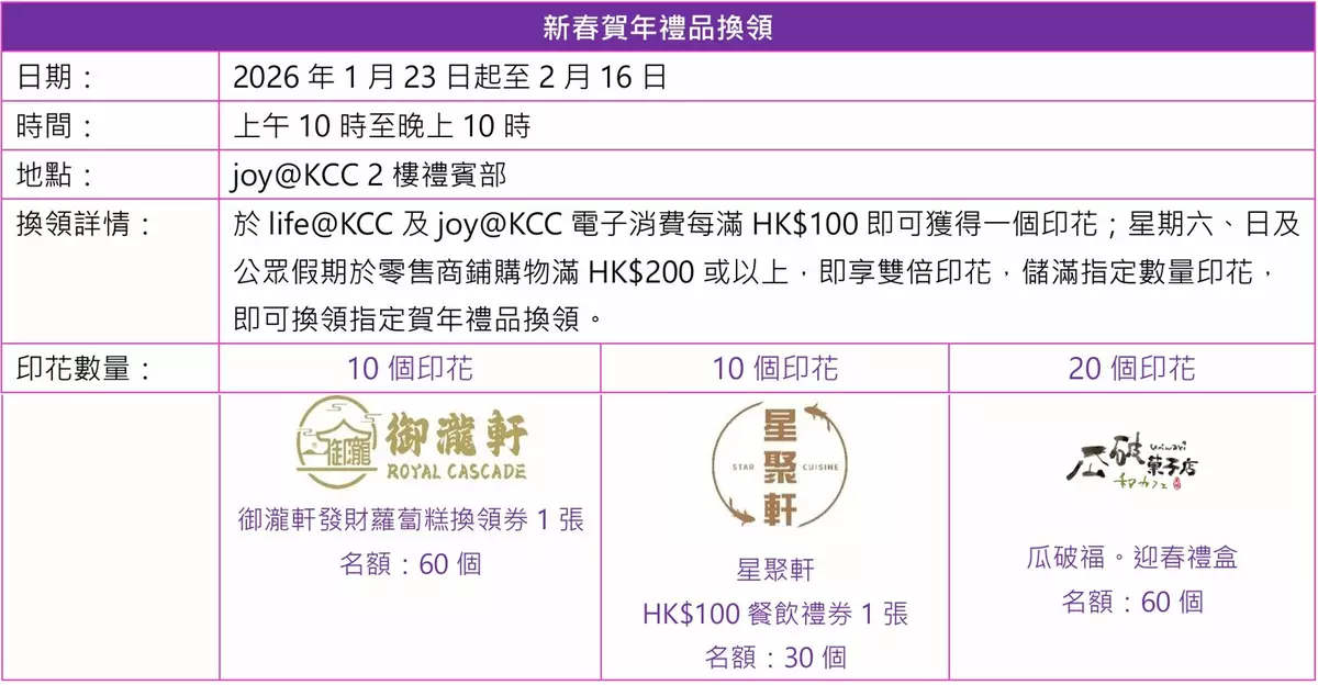 今個新春,商場精心舉辦3大「開運賀年消費禮遇」,陪你接福氣、慶豐年。在life@KCC逛街用餐之餘可憑消費滿指定金額,即可換領「千格玲瓏」限量版精緻利是封、賀年及情人節禮品,在這裡一站式辦年貨、享佳餚及預備派利是。