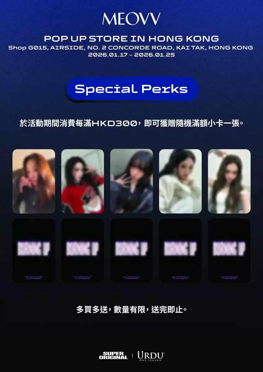 「MEOVV POP-UP STORE in HONG KONG」活動舉行期間,凡於店內選購MEOVV周邊商品每滿港幣$300,即可獲贈「MEOVV POP-UP STORE in HONG KONG」隨機滿額小卡1張(共5款,數量有限,先到先得,贈完即止)!