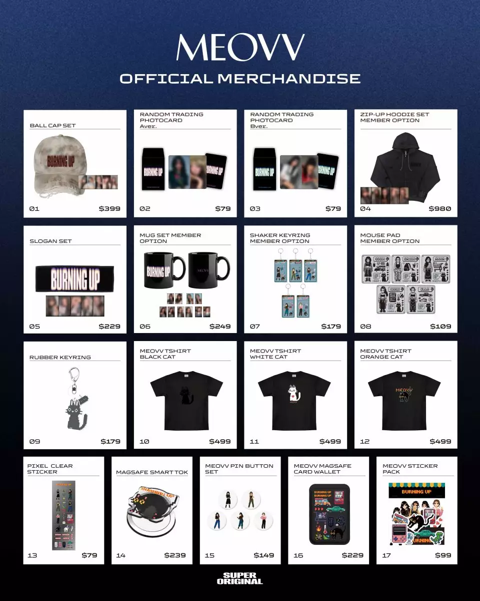 「MEOVV POP-UP STORE IN HONG KONG」推出融入MEOVV標誌性貓系元素的官方周邊商品,涵蓋日常穿搭與實用收藏,包括:充滿細節的LOGO Cap帽,印有單曲 LOGO連帽外套、短袖T-shirt、實用的MagSafe磁吸手機支架、磁吸卡套、隨機珍藏小卡、鎖匙扣等人氣周邊。精選周邊:倒入熱水會浮現隱藏LOGO的感溫水杯,水杯套裝更附有成員小卡,粉絲絕對要入手!
