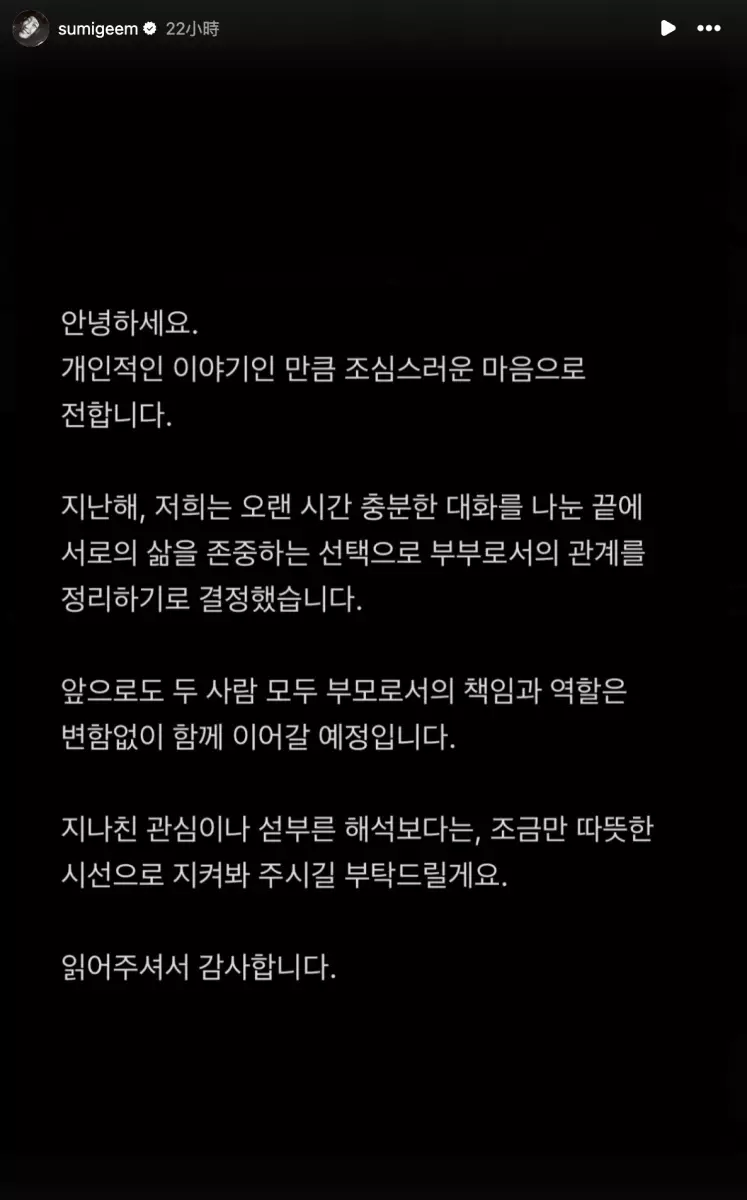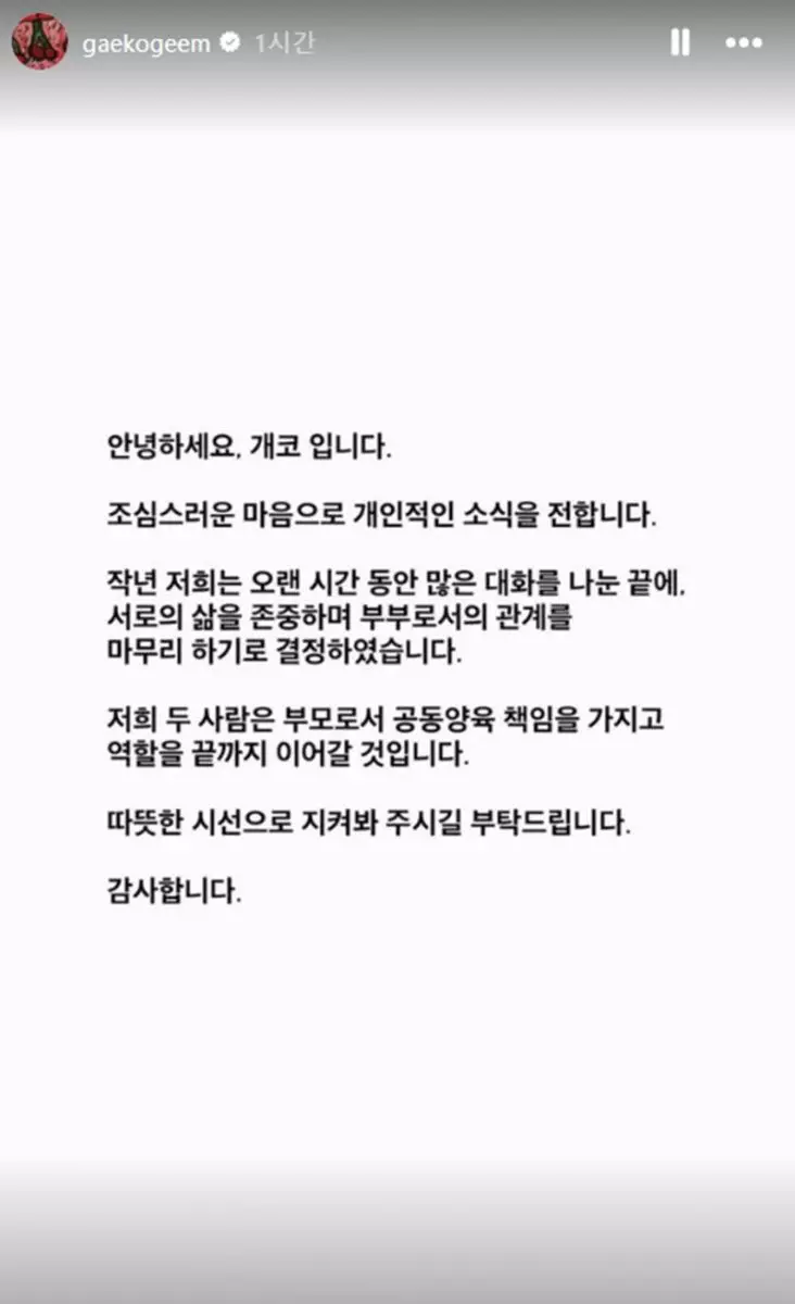 Gaeko在貼文中寫道:「去年我們經過長時間、多次的交流後,決定在尊重彼此人生的前提下,結束作為夫妻的關係。我們兩人將作為父母共同承擔養育責任,把各自的角色堅持到底。也懇請大家以溫暖的目光關注我們。」