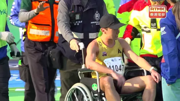 一名男跑手就在維園過終點後一度跌倒,需要坐輪椅離開。(陳裕行攝)