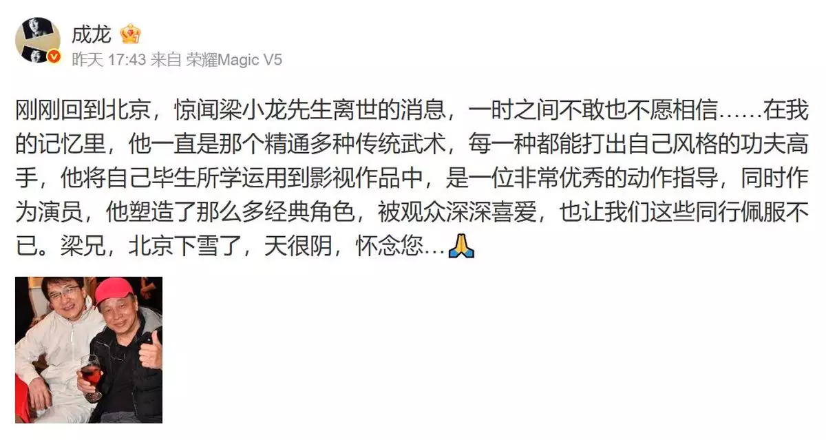 成龍發文悼念梁小龍。