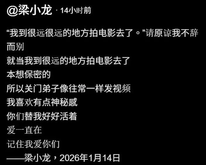 梁小龍的抖音帳號昨晚公開新帖文,是三張梁小龍的照片,以及他生前最後想對粉絲們說的話,「『我到很遠很遠的地方拍電影去了。』請原諒我不辭而別,就當我到很遠的地方拍電影去了,本想保密的,所以關門弟子像往常一樣發視頻,我喜歡有點神秘感,你們替我好好活著,愛一直在,記得我愛你們」。
