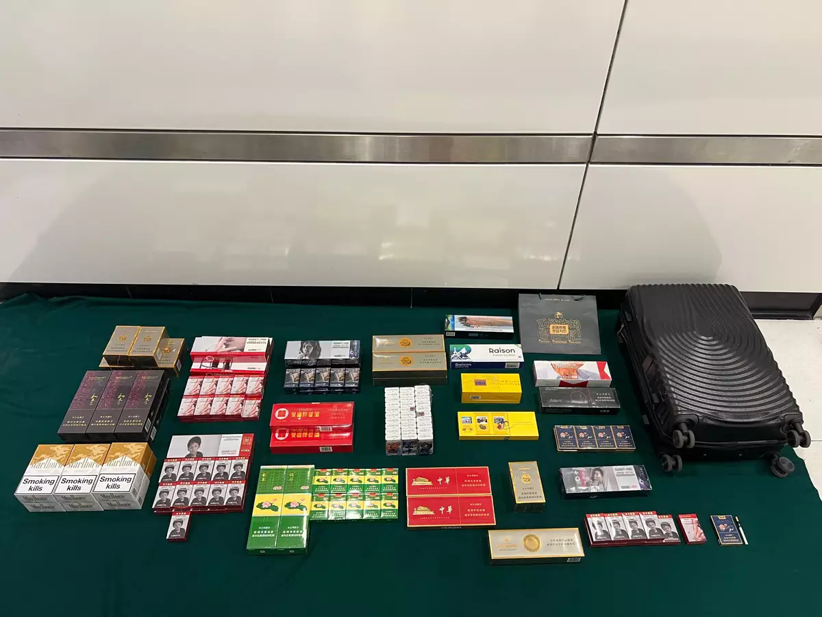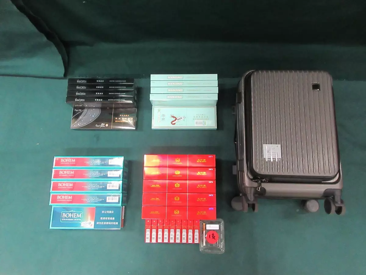 海關於本月11在落馬洲支線管制站截查一名43歲抵港女旅客,在其攜帶的個人行李及身穿外套的口袋內共檢獲近10800支未完稅香煙,市值約44000元。該名旅客隨即被捕。她被法庭判監4個月及罰款1千元。