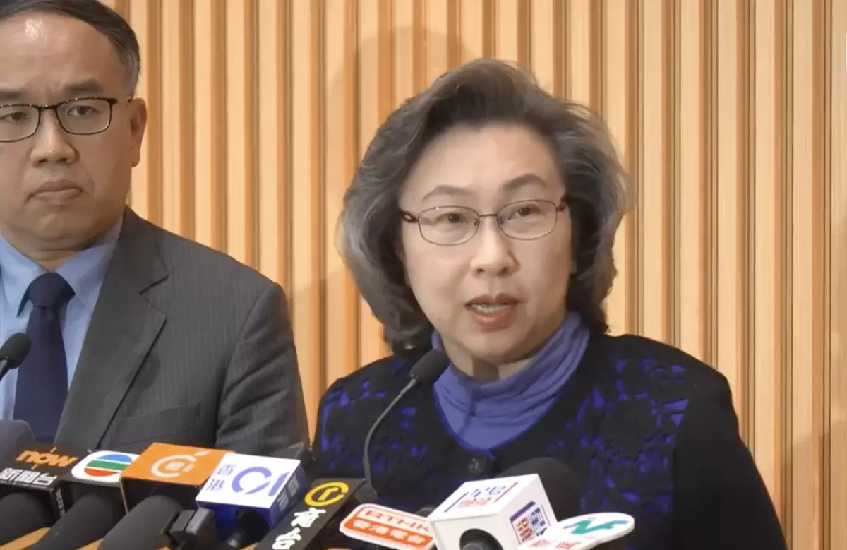 公務員事務局局長楊何蓓茵公布就採購樽裝飲用水事件進行的紀律調查結果。視頻截圖