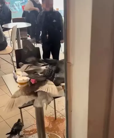 只見片中十幾隻野鴿聚集在一張餐枱上,瘋搶枱上的食物並大快朵頤,而至有飲品及部份食物倒瀉一地。期間雖然有一名男童嘗試揮手驅趕野鴿,但不成功,而坐在餐枱另一則的小妹妹則無奈地呆望着這群不速之客搶去他們的食物!