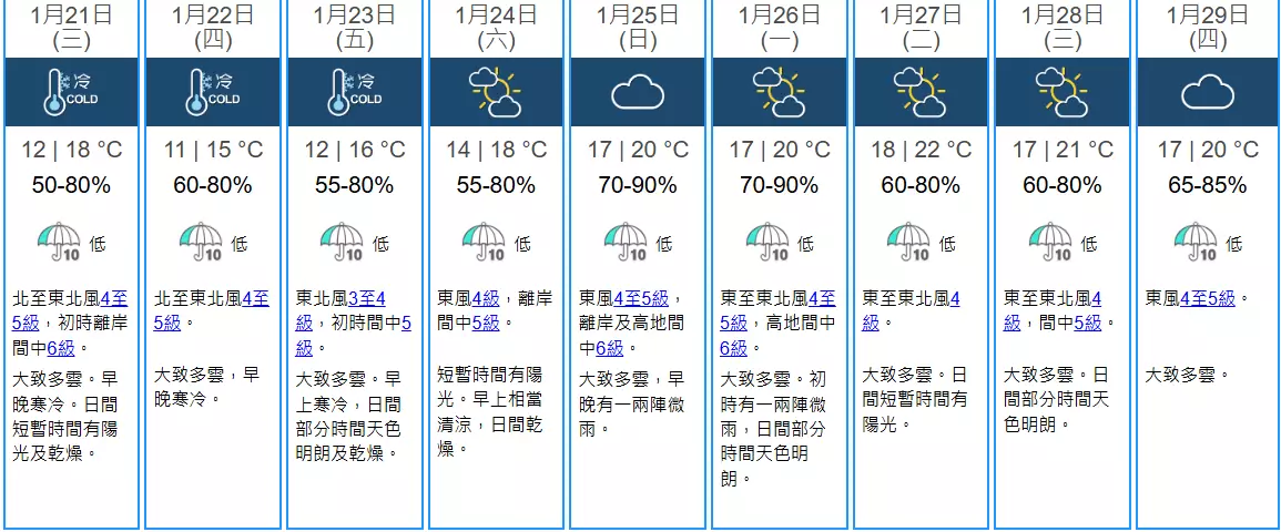 受強烈冬季季候風影響,預料星期四及星期五大致多雲,天氣持續寒冷,市區最低氣溫在11、12度左右,新界再低兩三度,日間氣溫回升幅度較小。周末期間早上仍然清涼。