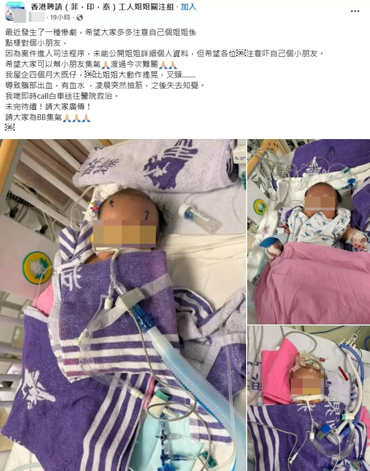 日前有網民在社交平台群組發帖,指自己家中近日發生了慘劇,「希望大家多多注意自己個姐姐係點樣對個小朋友」他表示由於案件已進入司法程序,所以未能公開外傭的資料。他上載兩張相片,並表示家中四個月大的囝囝,不幸遭外傭「大動作搖晃、叉頸」導致腦部出血、凌晨突然抽筋及失去知覺,家人即時將男嬰送院救治,他希望網友可以為BB「集氣」,渡過難關!