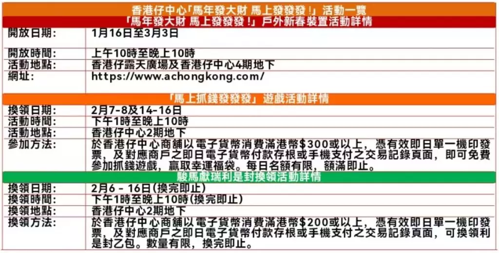 除了一連串滿Fun 爆Luck的新春打卡裝置外,香港仔中心特意趁佳節送上2大「好運滿馬」雙重消費禮遇!於2月7-8及14-16日憑消費即可免費參加抓錢遊戲,贏取幸運福袋,祝願大家駿馬生財,「馬」上行大運! 另外,2月6-16日,只需憑消費更可換領駿馬獻瑞利是封,將誠摯祝福傳遞給摯愛的親友,共迎新春喜悅!