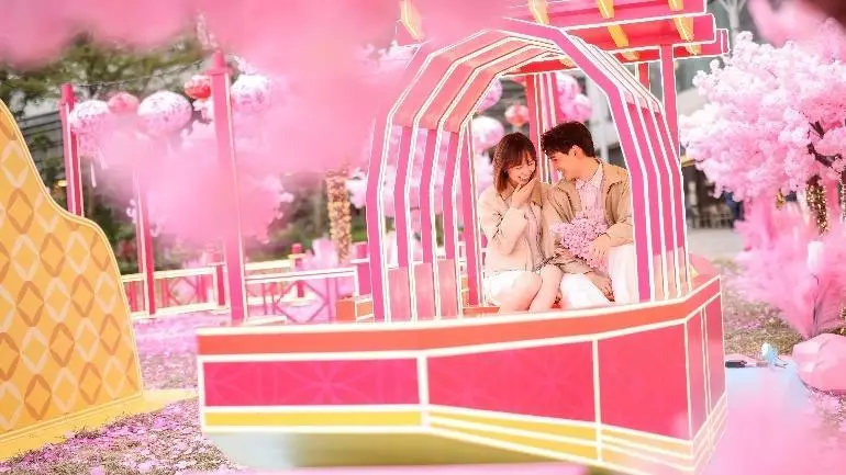 靈感源自園林雅致意境,亭台以細緻格柵與古典花燈巧妙構築,營造一方禪意盎然的休憩空間。亭內設有雅緻座席,讓您暫離煩囂,靜賞漫天粉櫻輕舞,沉浸於溫柔光影交織的浪漫櫻下時光。