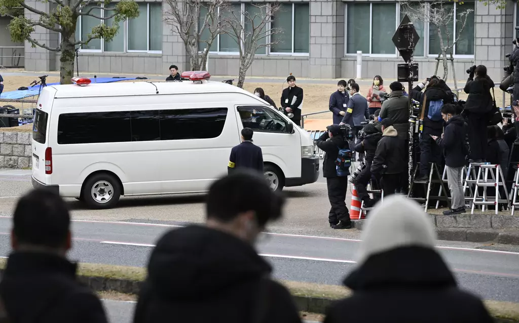 載着山上徹也的囚車抵達奈良法院。AP圖片