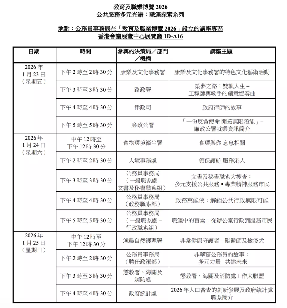 楊何蓓茵及公務員事務局常任秘書長林雪麗參觀政府部門的展區,並與學生傾談,了解他們的生涯規劃和對政府工作的想法。公務員事務局今年在場內首設政府講座專區,首日舉行的四場講座反應熱烈,不少參加者在聽取有關飛行服務隊、警務處爆炸品處理課、天文台應用人工智能分析颱風的工作,以及青年公務人員赴聯合國任職的經驗分享後均表示對政府工作有濃厚興趣。