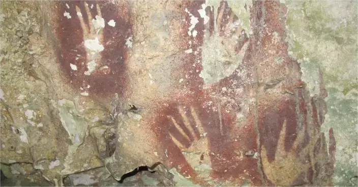 印尼洞穴出土6.8萬年前紅色手印岩畫,為人類最早遷徙至澳洲提供關鍵證據。AP圖片