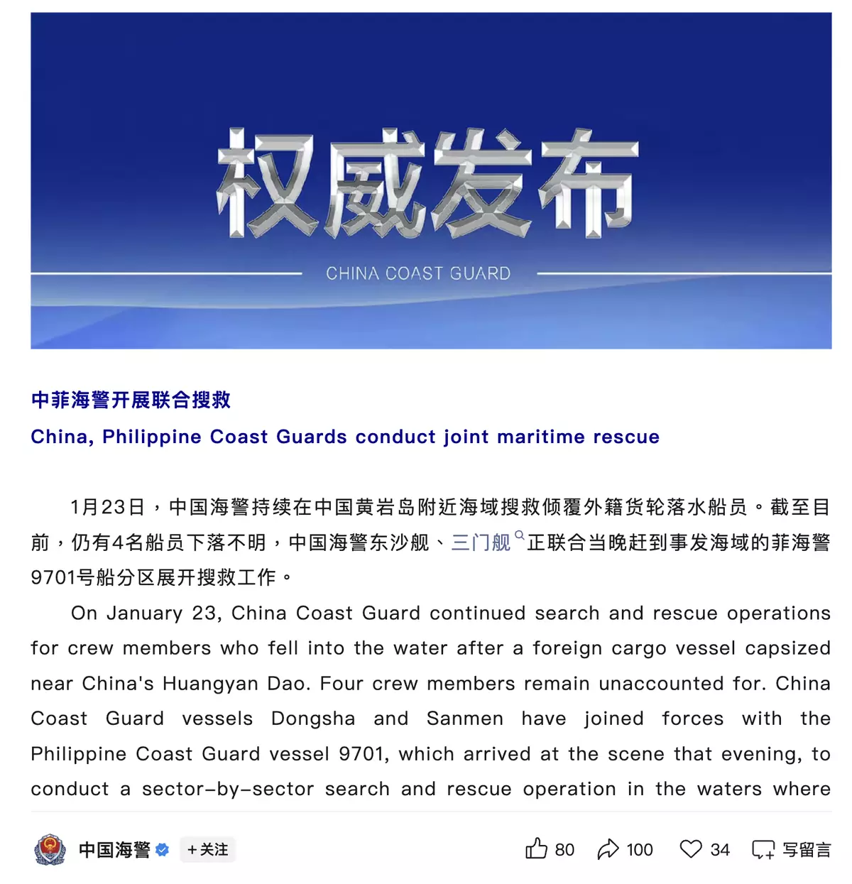 事發後,中國海警立即派遣兩艘海警艦,到出事海域展開搜救,目前救起23人,相關救援工作仍在持續。
