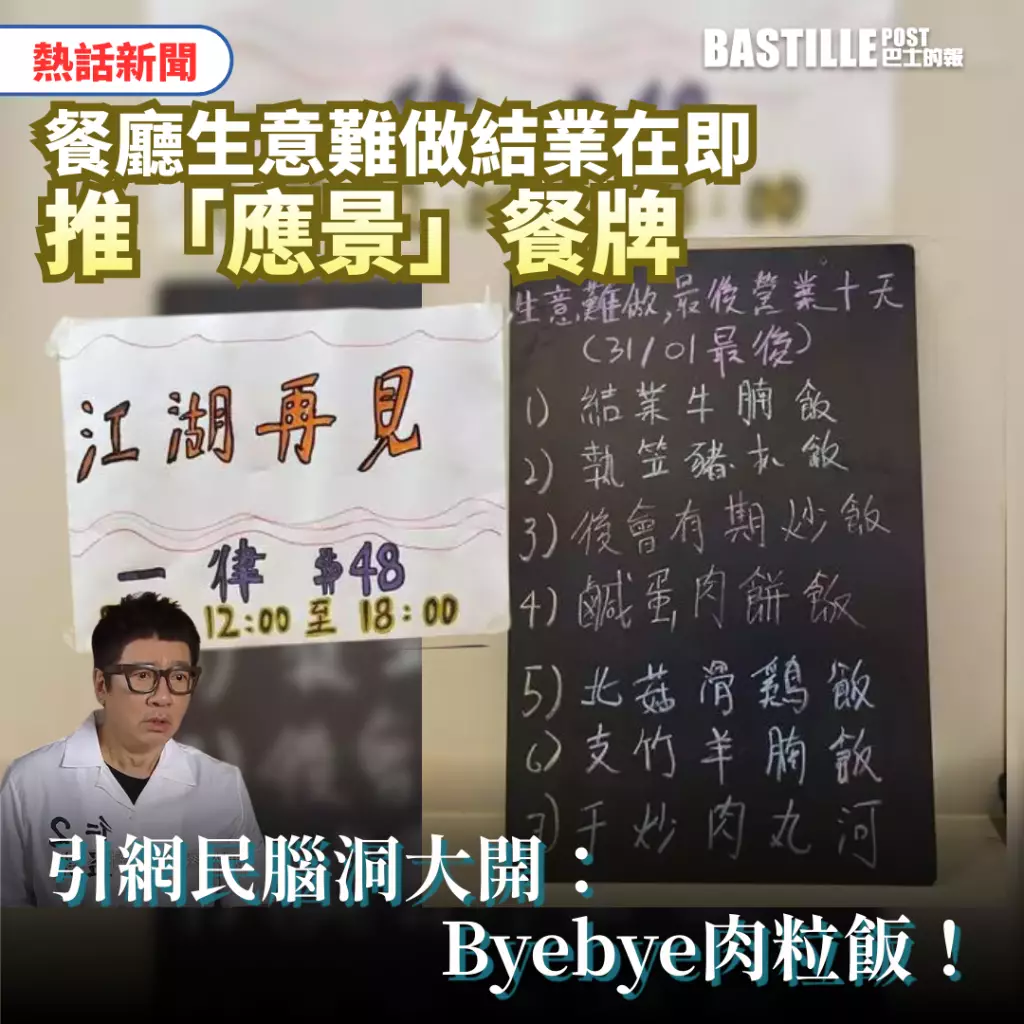 香港近幾年餐飲業一直處於低迷狀態,不少食肆生意大不如前,面臨執笠危機。日前就有食客在網上發帖,指旺角有餐廳離最後營業仍有10天,特地推出應景特色餐牌,引發網民無限創意,為「碟頭飯」起搞笑餐名。