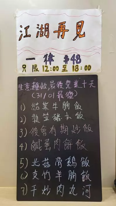 此食客在社交平台群組發文表示「又一小店敵不過貴租而結業」,而該餐廳位於旺角。由上載的相片所見,餐牌寫着「生意難做,最後營業10天」而推出的套餐客飯共有7款,供應時間由中午12時至6時,其中頭三個客飯的名稱十分有趣,似是店主苦中作樂,自嘲一番。有「結業牛腩飯」、「執笠豬扒飯」及「後會有期炒飯」。樓主後來揭曉「後會有期炒飯」其實是「生炒雞粒炒飯」。